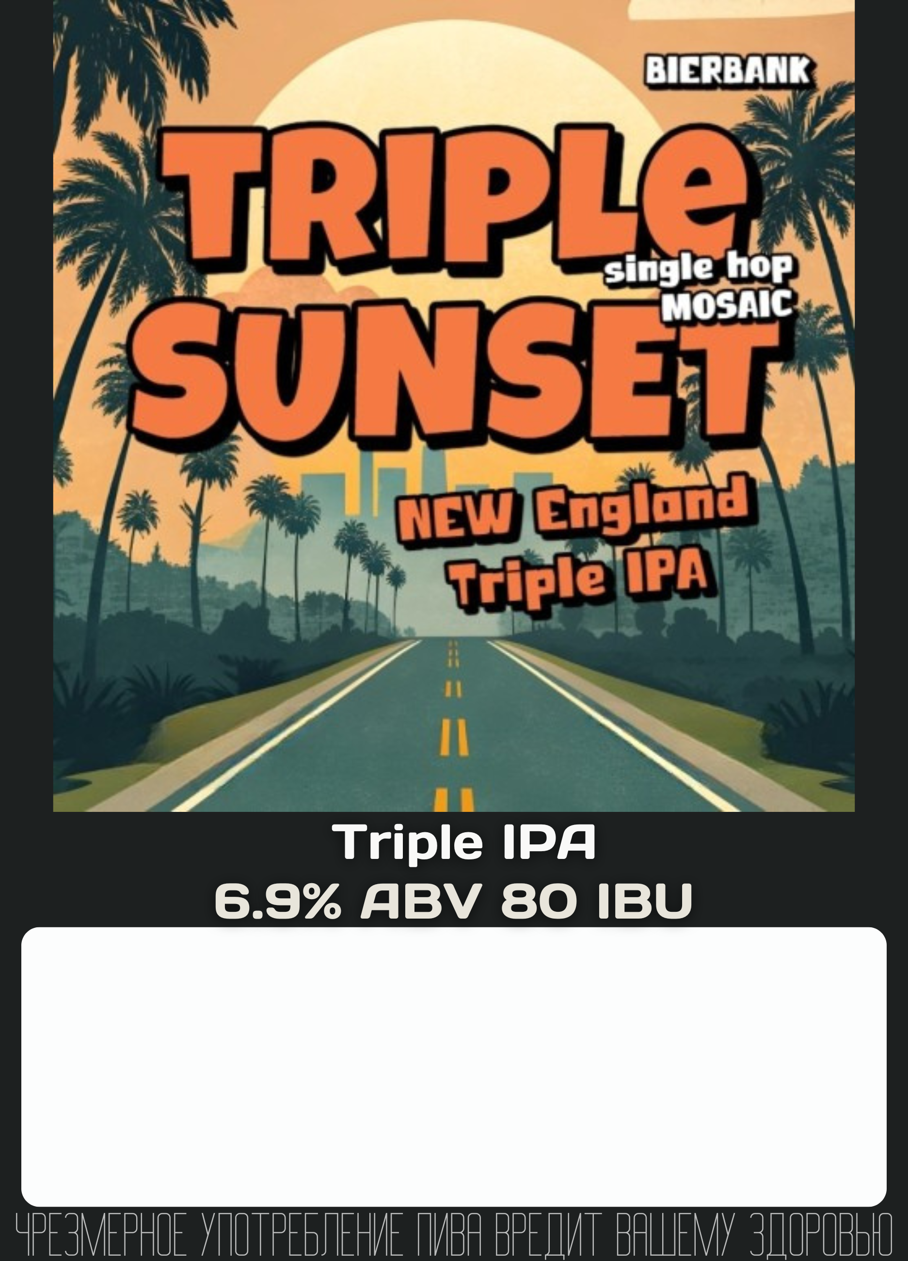 Triple Sunset – многогранный и очень ароматный New England Triple IPA, охмелен большой дозой американского Mosaic. Легкий на первый взгляд, но очень коварный IPA, имеет глубокий аромат спелых сочных фруктов, ягод, пряных трав, слегка приправлен капелькой смолы и запахом молодой ели.